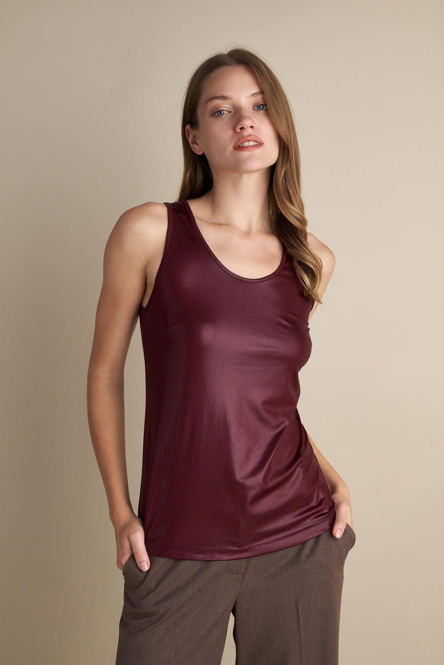 - Sleeveless cut with clean neckline