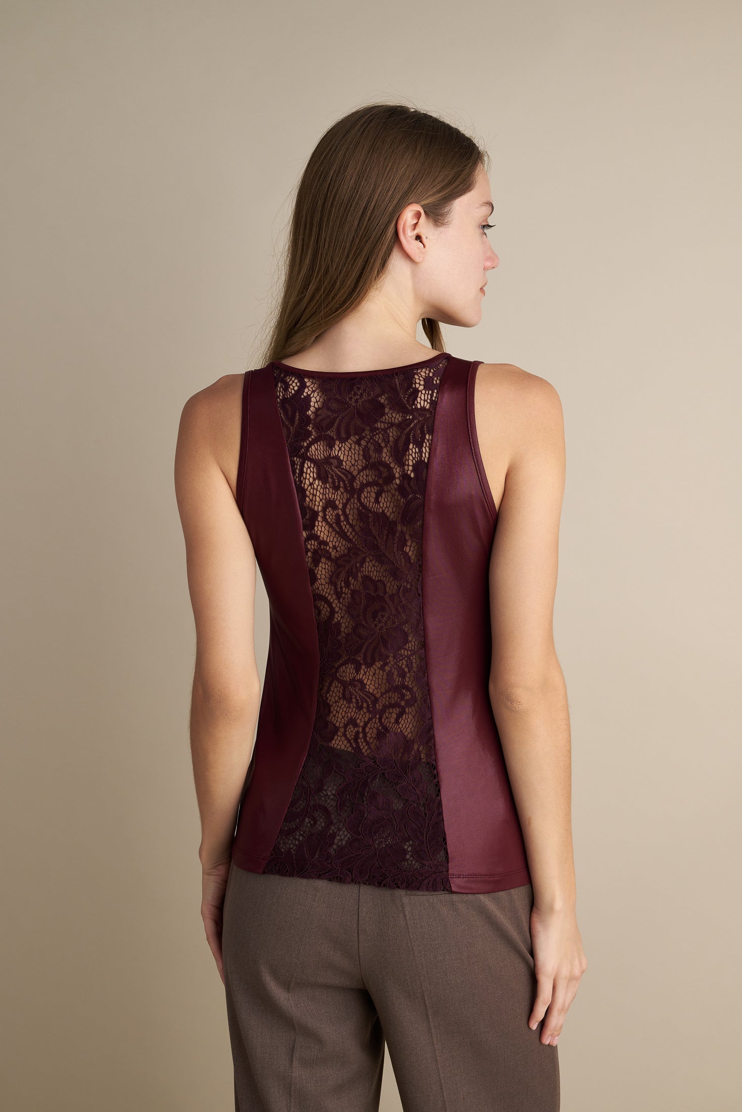 A sleeveless silhouette in liquid-shine fabric, designed to contour and contrast. Featuring bust darts for subtle shaping and a lace-paneled back for unexpected texture and allure. The high neckline and clean finish make it ideal for layering under tailored jackets or styling solo for evening edits.