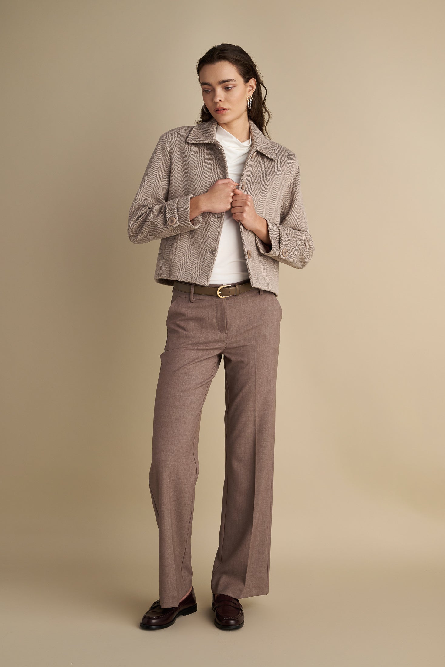 Low rise flare pants with side pockets, zip fly, button fastener, beltloops, and welt pockets in the back. Model Height: 1.82