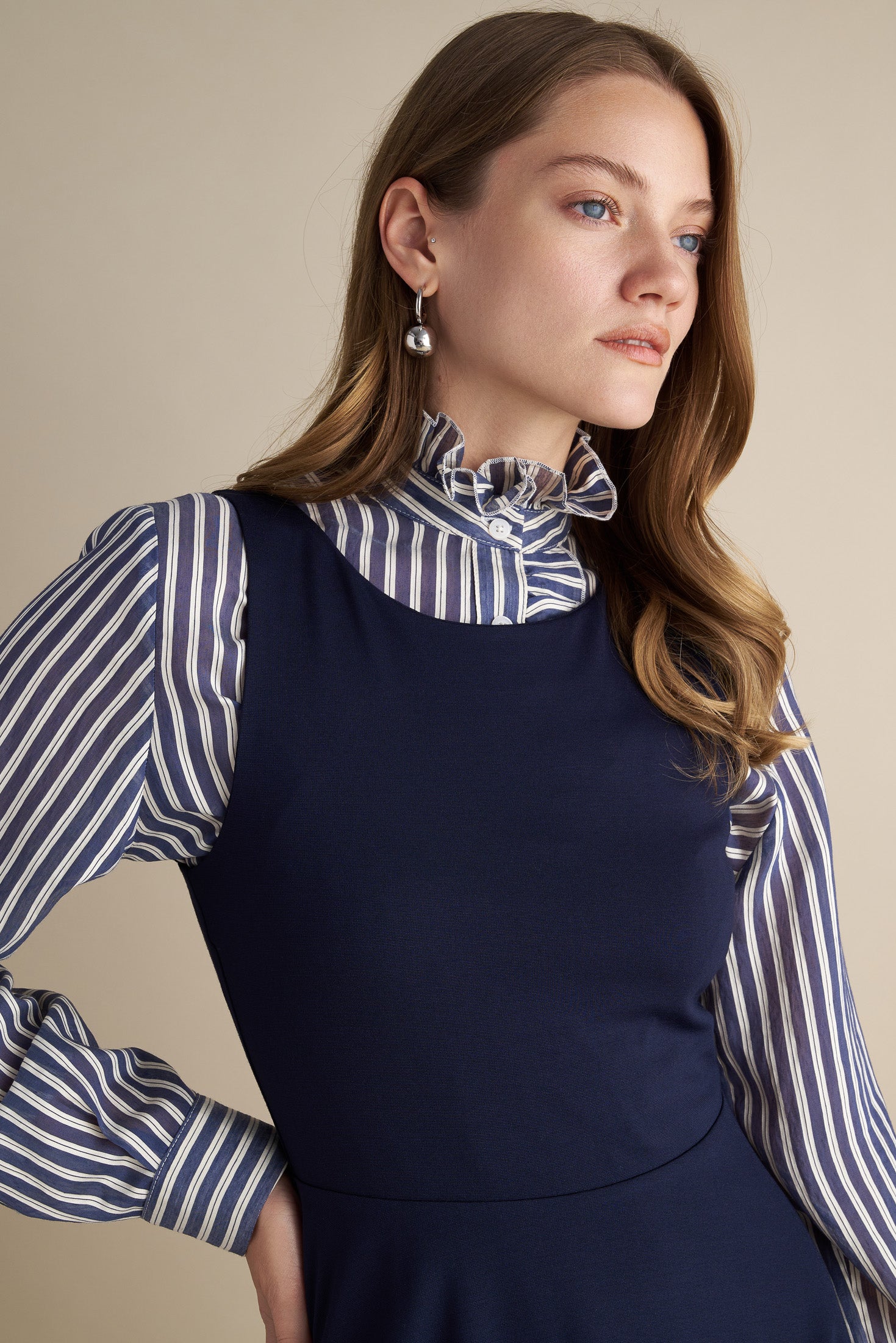 A sculptural silhouette in stretch Ponte fabric, designed for modular layering and directional styling. Sleeveless and mid-length, it features a clean back zipper and an asymmetric skirt that reveals a striped underlayer for unexpected contrast. Pair it with a ruffled shirt or turtleneck for elevated daywear or minimalist evening edits.