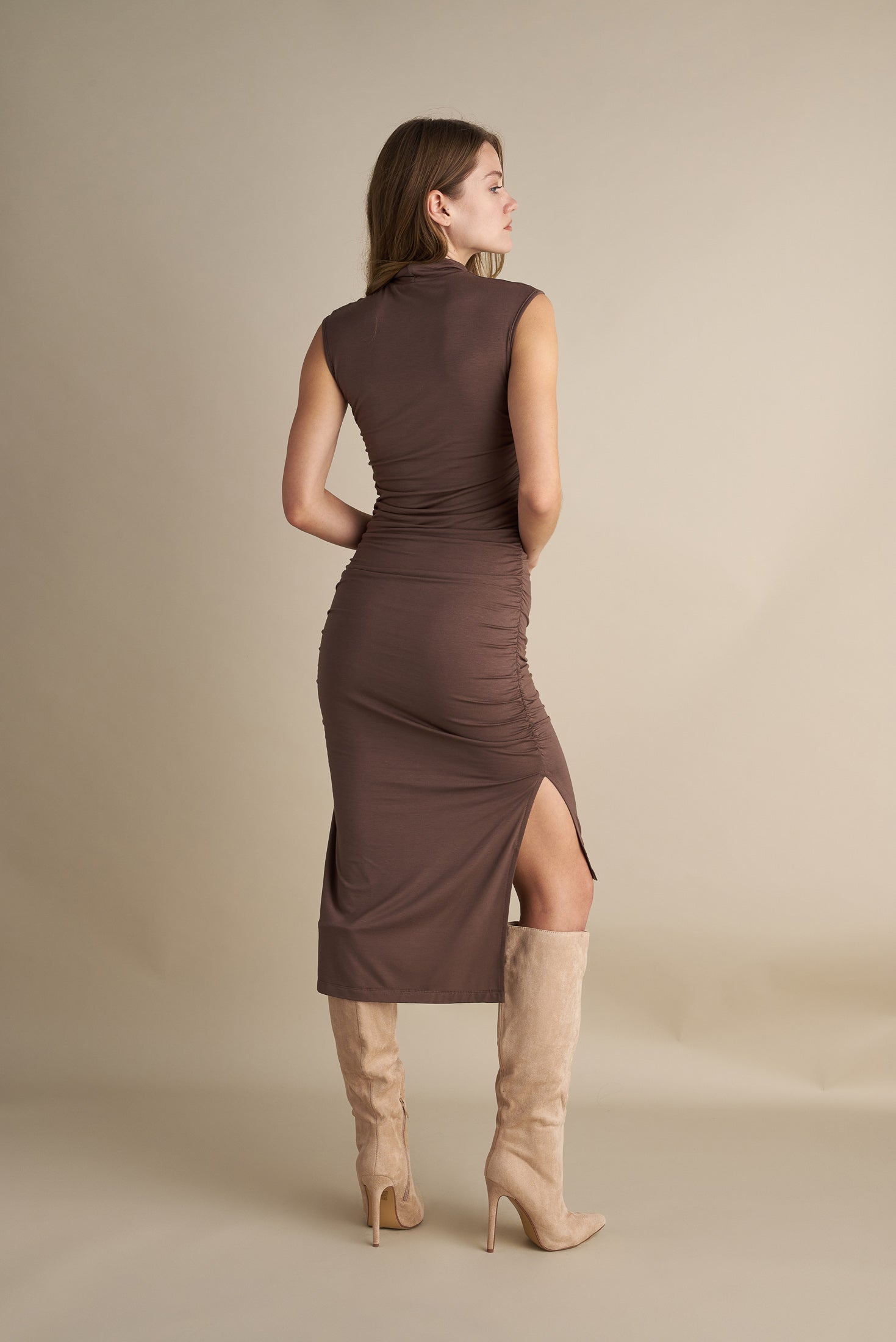 Mid length dress in soft jersey fabric. Designed with a sleeveless, high-neck silhouette and asymmetric hemline with slits on each side.