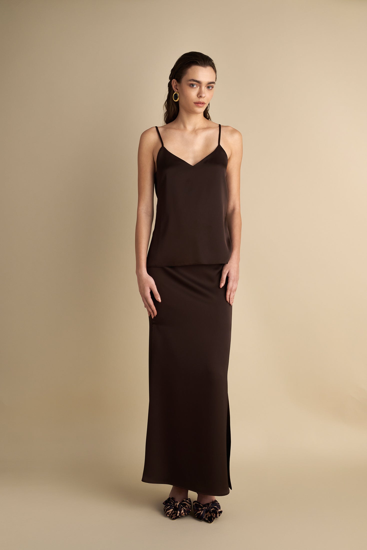 High-waisted satin skirt in rich espresso brown, featuring side slits on both legs for fluid movement and understated allure. The invisible back zipper ensures a seamless fit, while the ankle-length cut adds elegance to both day and evening styling. Sleek, sensual, and quietly bold.