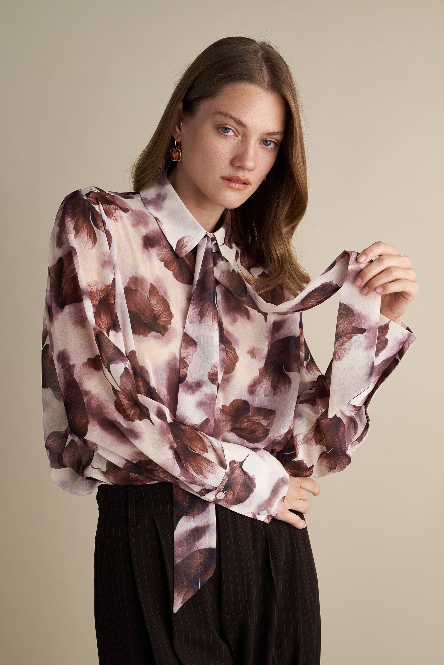 Winter Petal Shirt – A delicate bloom in cool-season tones. This long-sleeved blouse features a soft floral print in oak and ivory, with a detachable tie that can be styled as a neckpiece or accessory. The front placket is finished with hidden buttons for a clean silhouette, while a subtle loop at the back collar secures the tie in place. Designed for layering and effortless elegance, it transitions seamlessly from office hours to evening outings.