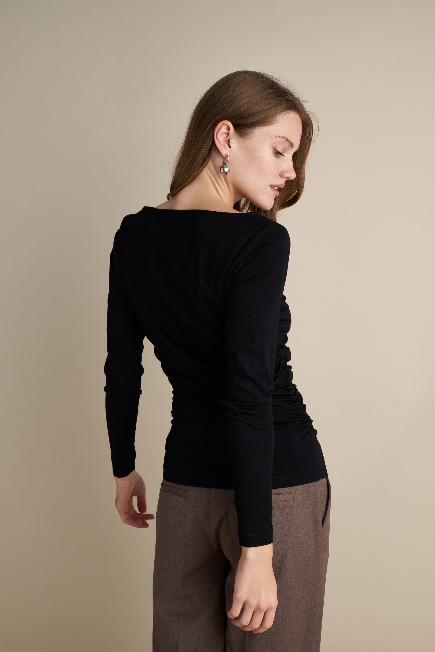 Boat neck, long sleeve made of stretch rayon blend. Rushed details on bust and sidelines.