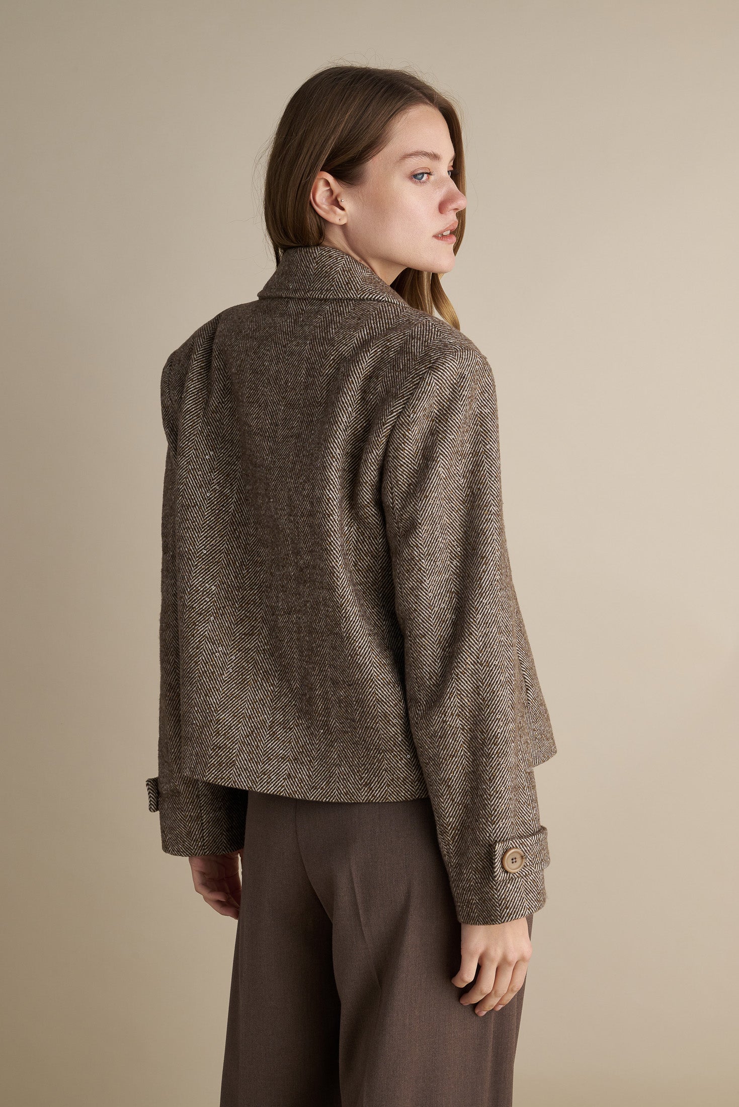 A warm, short blazer coat in speckled herringbone fabric with translucent sequins that add subtle texture and light-catching detail. Fully lined for comfort and structure, it features shoulder pads, a tailored collar, welt pockets, and sleeve belts for adjustable styling. Designed for effortless layering, this piece merges classic tailoring with modern shimmer—ideal for transitional dressing and refined everyday looks.
